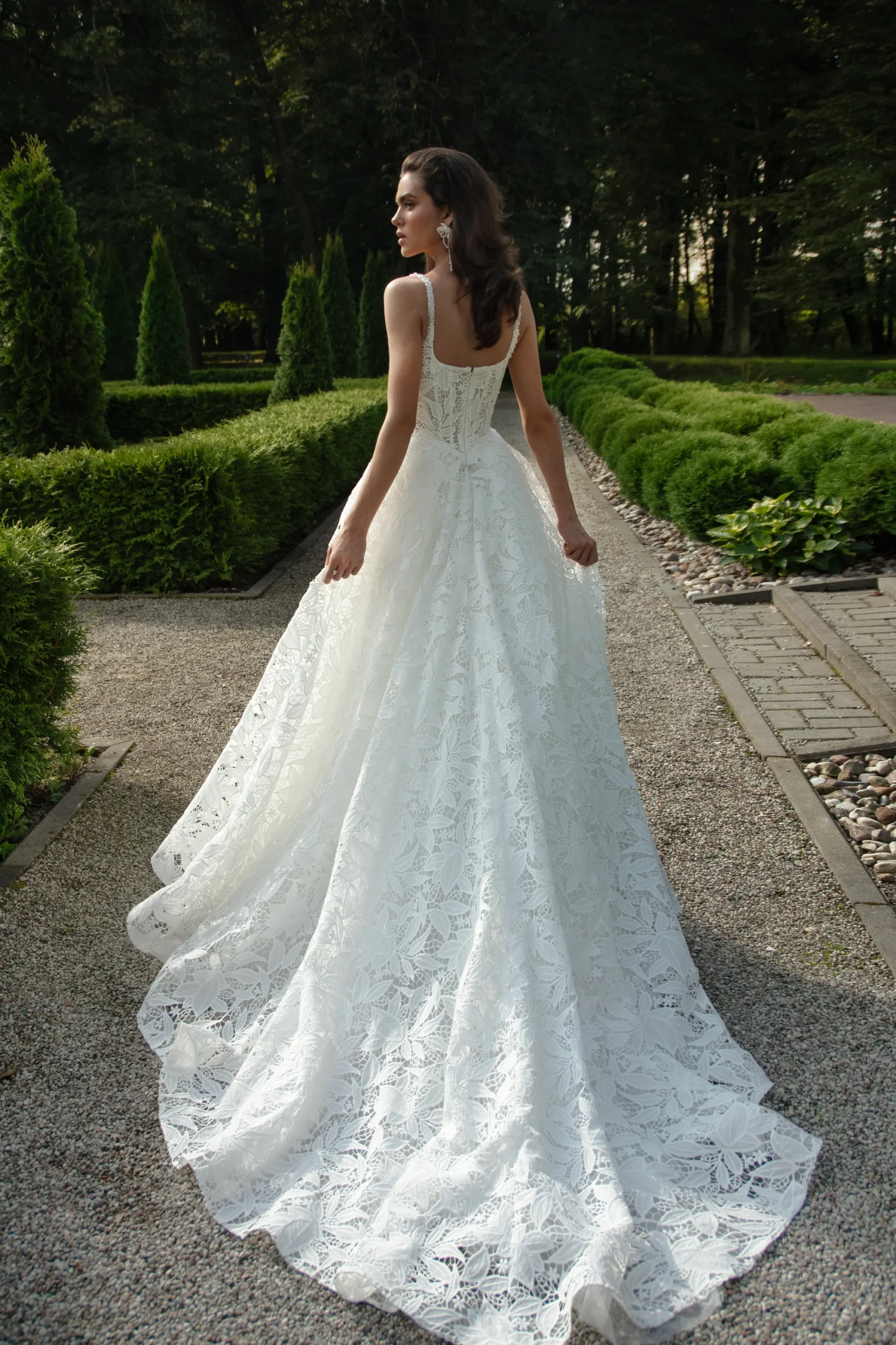Наталья РомановаИзысканное свадебное платье А‑силуэта из нежного кружева с тонкими бретелями, украшенными жемчужной вышивкой. Лаконичный крой подчёркивает утончённость образа, а жемчуг добавляет изящный акцент и романтичное сияние.