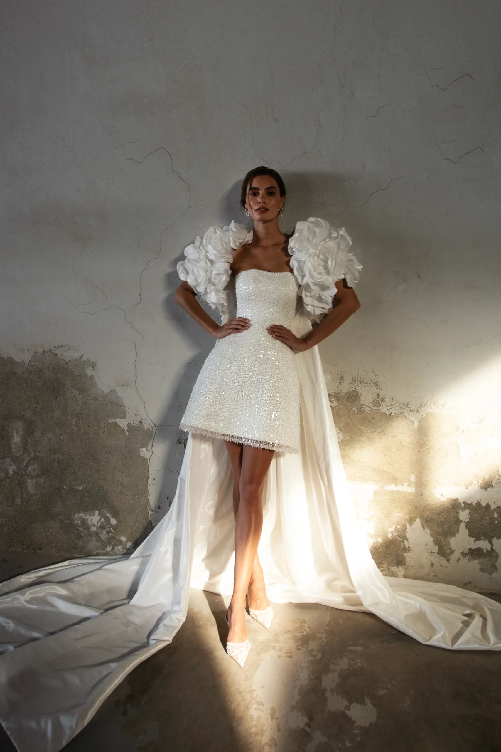Наталья РомановаСовременное короткое свадебное платье из атласа, расшитое сияющими пайетками и глиттером. Образ дополняет съёмное болеро с 3D‑цветами и длинным шлейфом, предлагающееся отдельно, что позволяет легко трансформировать наряд — от дерзкого и лёгкого до торжественного и романтичного.