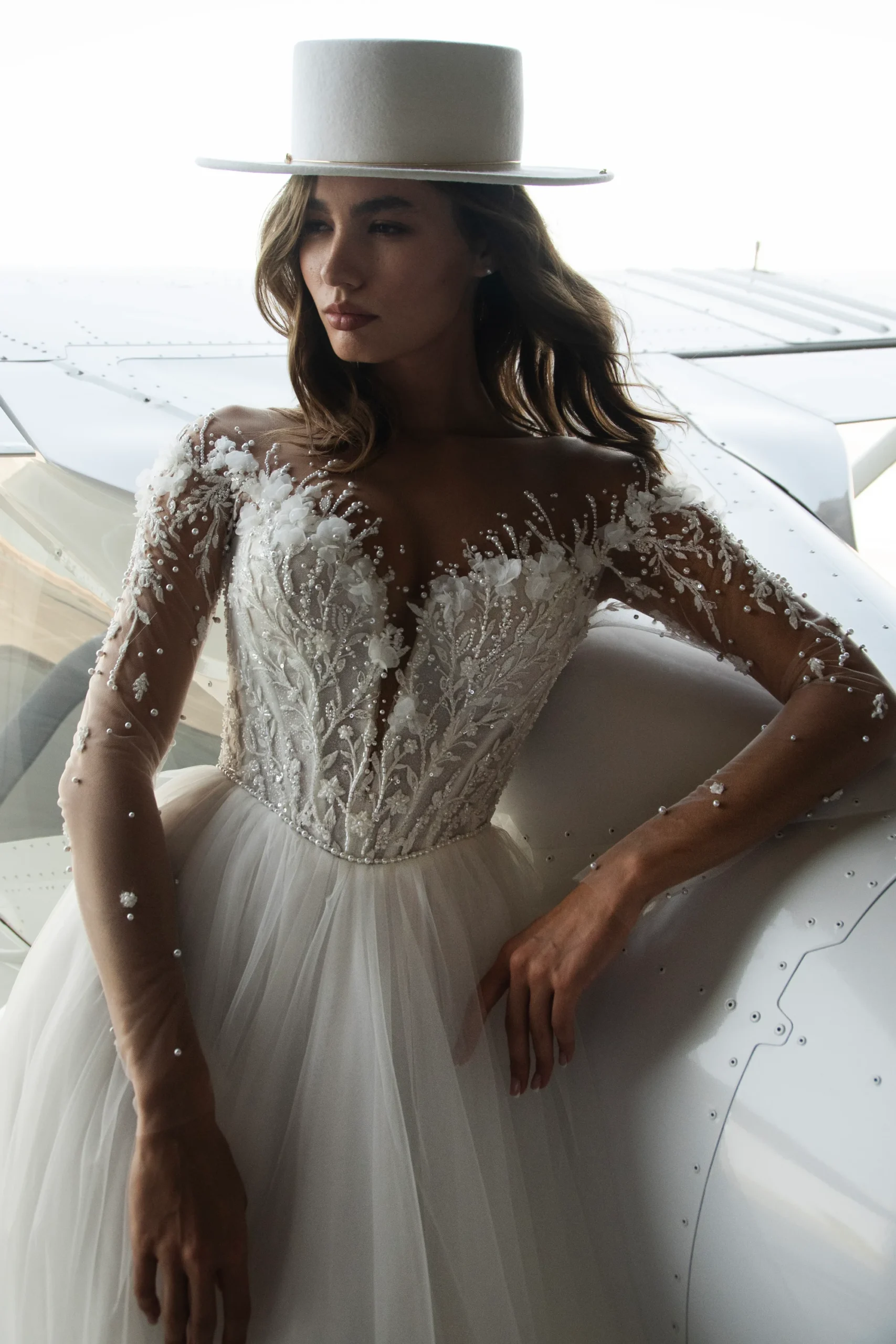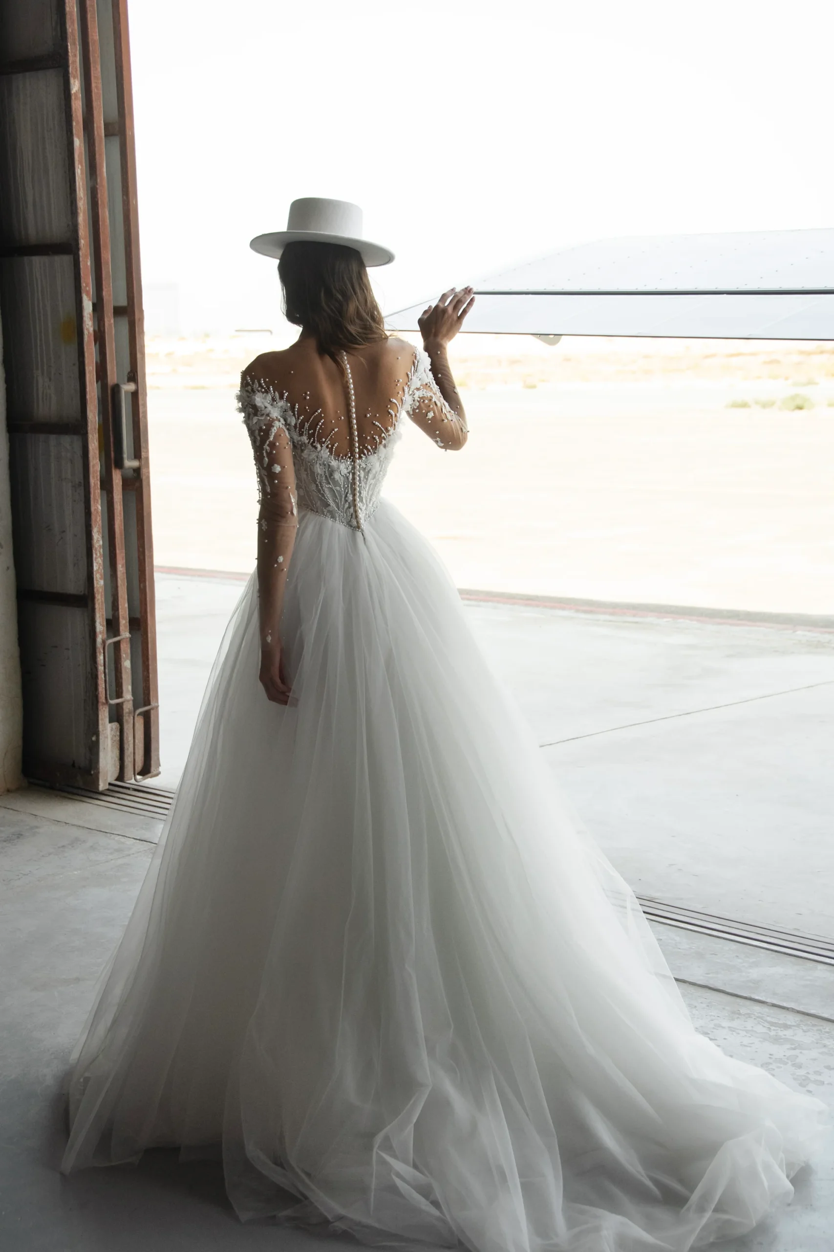Наталья РомановаИзысканное свадебное платье А‑силуэта из воздушного фатина с элегантным V‑образным вырезом. Корсет расшит бисером и жемчугом, создавая утончённое мерцание и благородный акцент. Лёгкий силуэт подчёркивает романтичность образа, а жемчужные детали добавляют ему изящного сияния и торжественного шарма.