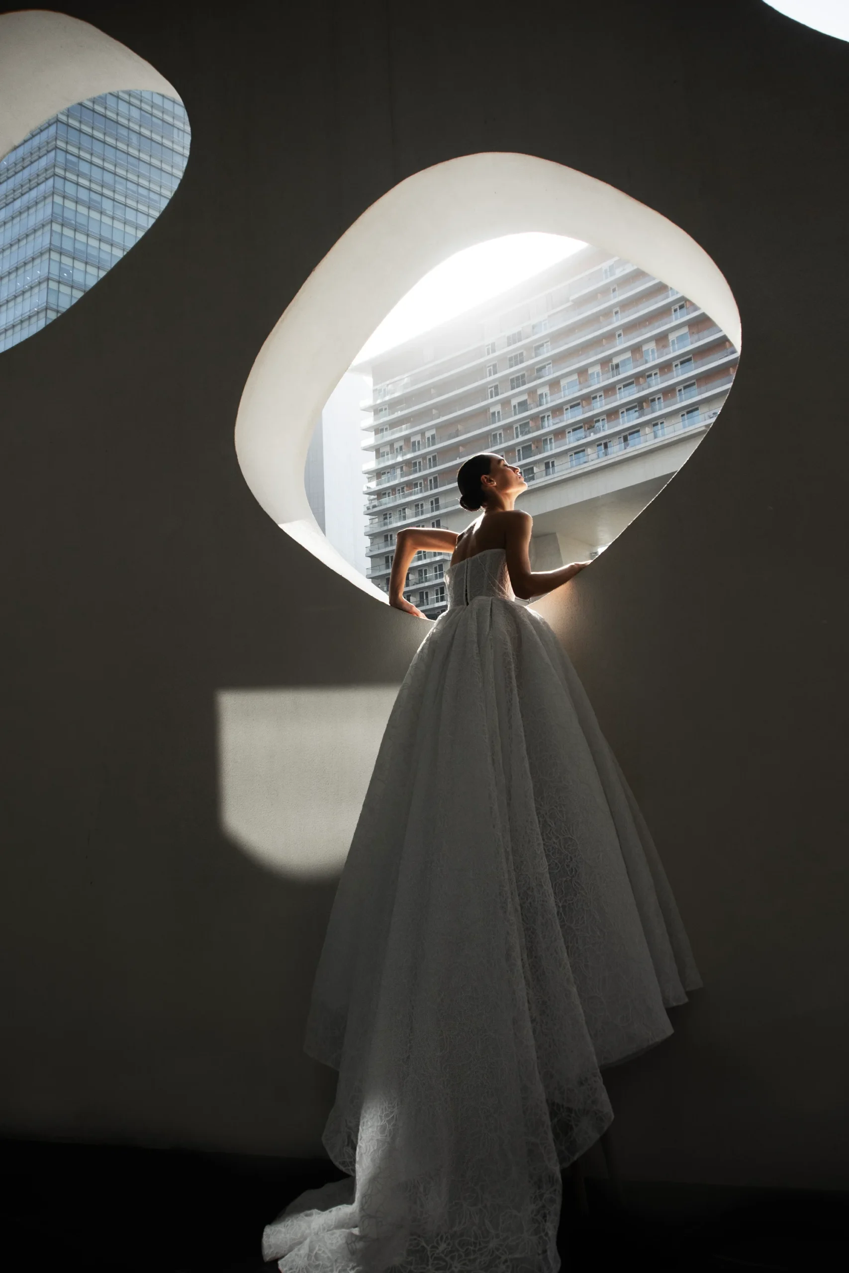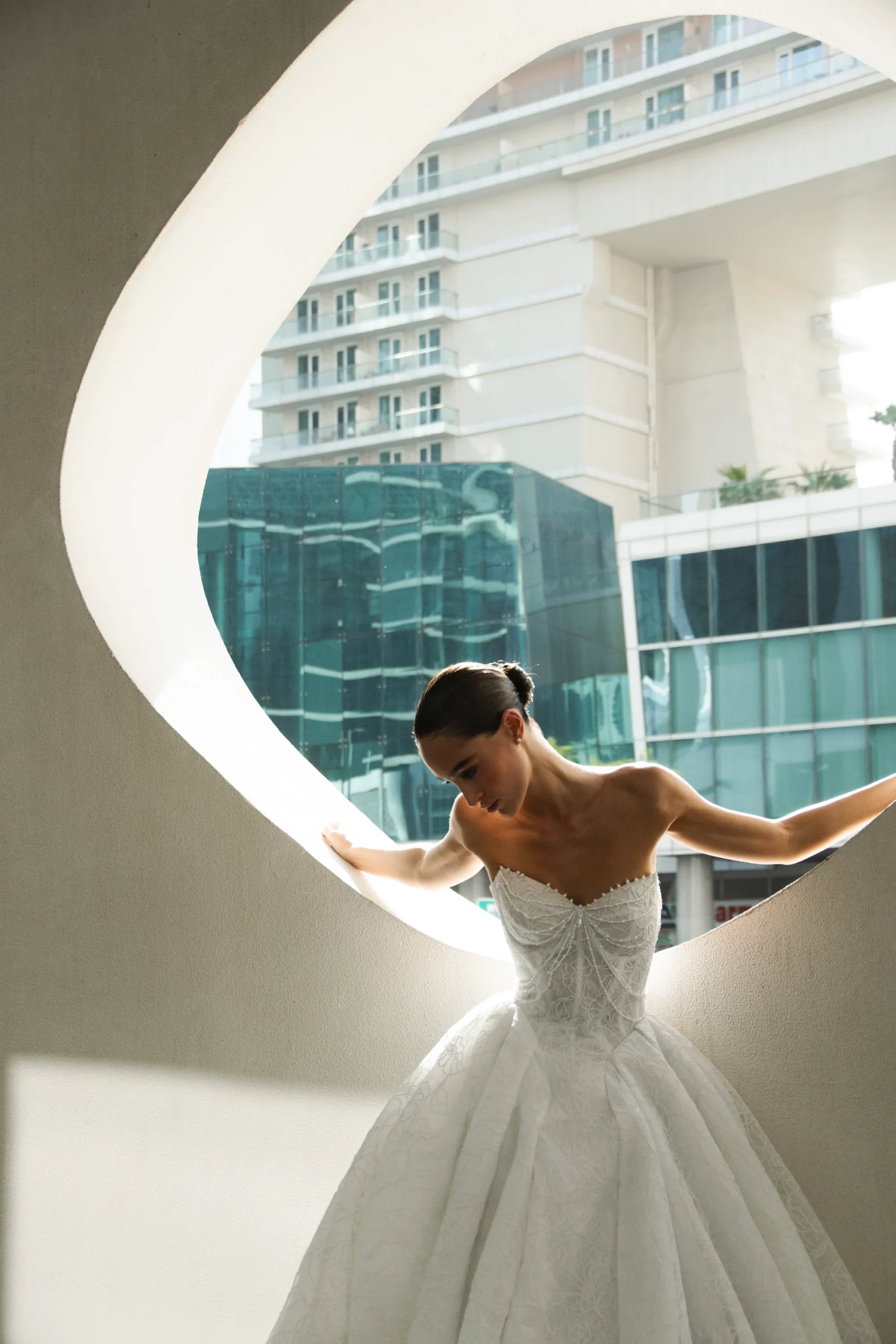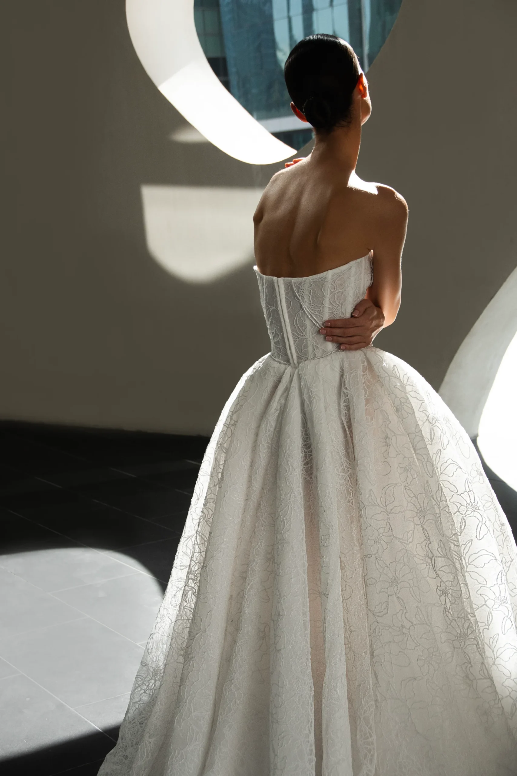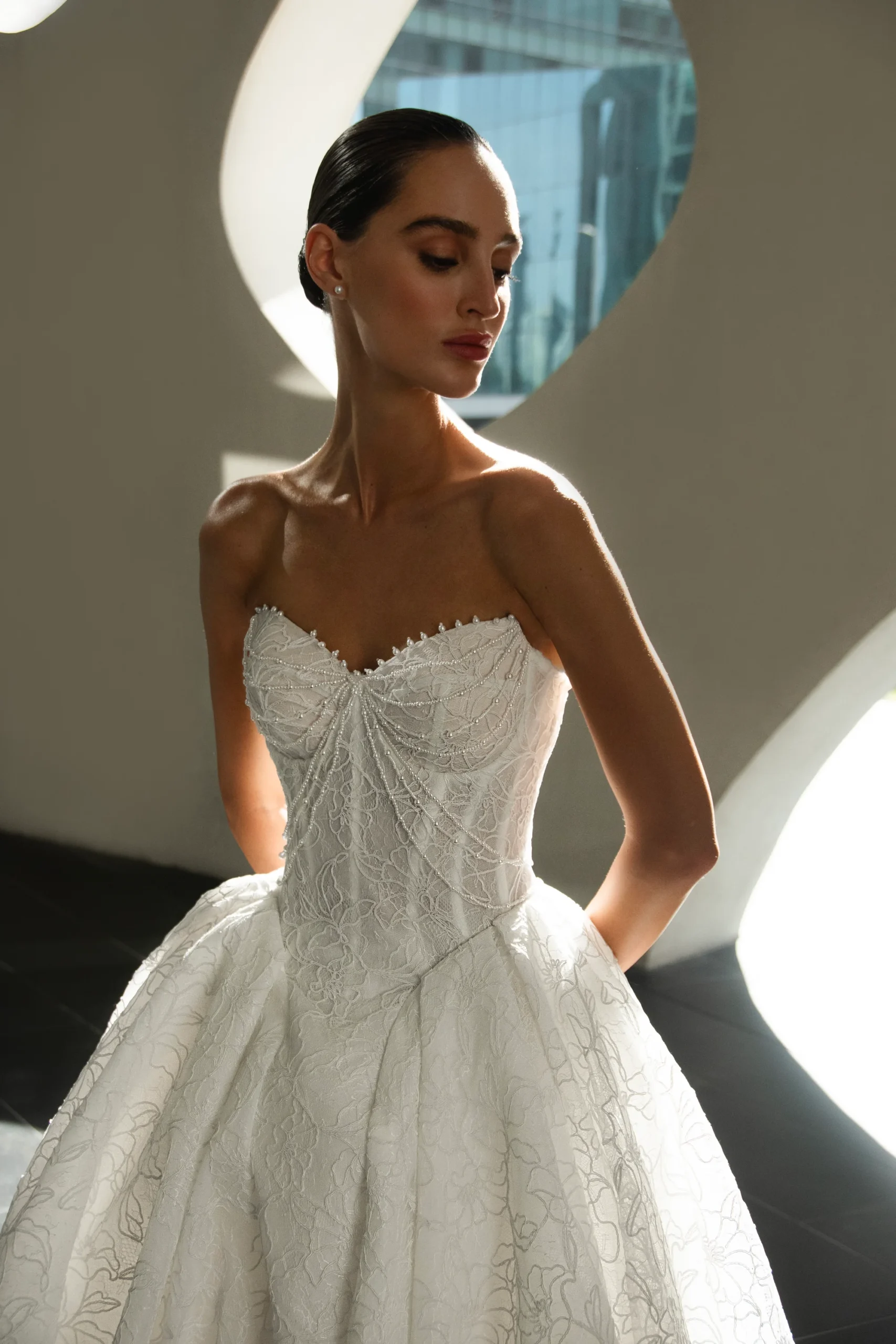 Патрисия КутюрРоскошное свадебное платье бального силуэта из изысканного кружева с пышной юбкой. Корсет украшен нитями жемчуга, создающими утончённое сияние и благородный акцент. Эффектный крой подчёркивает торжественность образа, а кружевная фактура придаёт ему романтичность и королевский шарм.