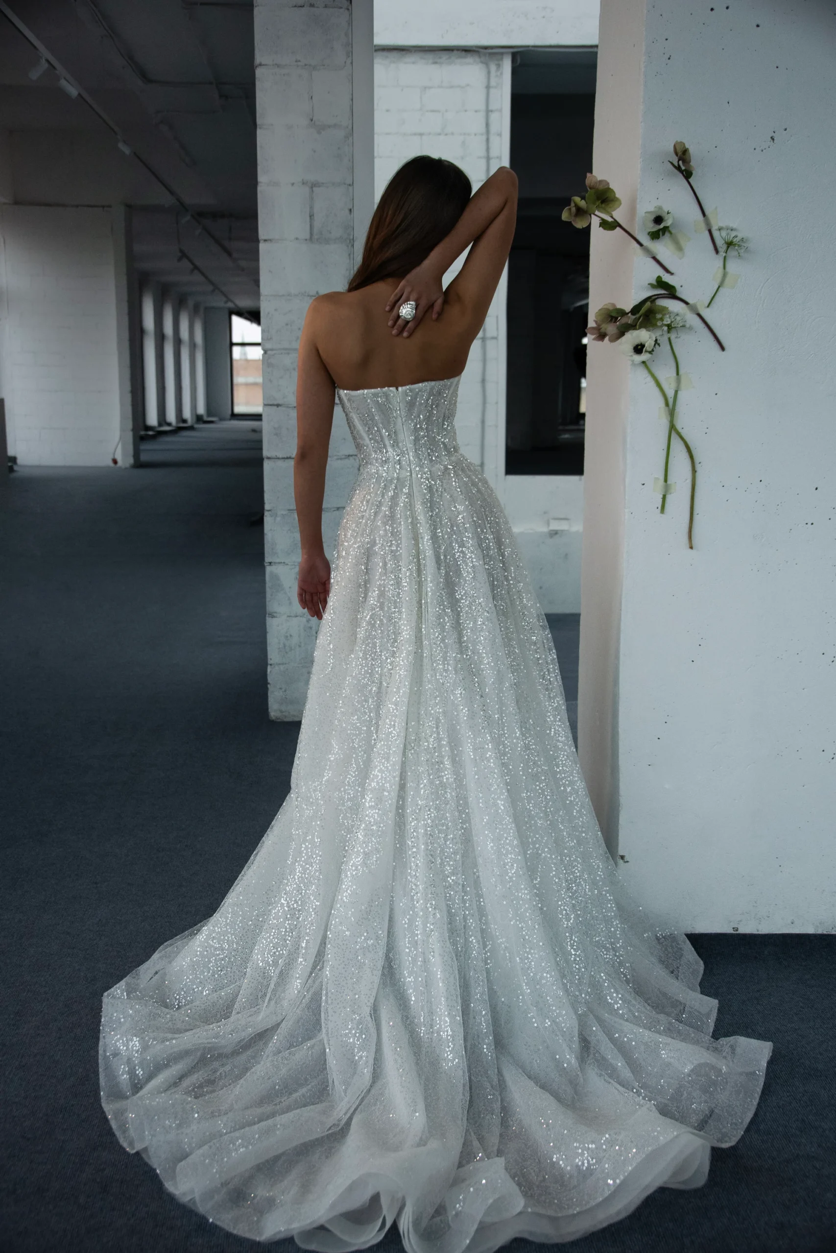 СонестаCвадебное платье А‑силуэта из воздушного фатина с мерцающим глиттером. Корсет украшен нитями жемчуга и напылением из кристаллов, создающих утончённое сияние и благородный акцент. Лёгкий силуэт подчёркивает романтичность образа, а сочетание переливающихся деталей придаёт ему торжественный и по‑настоящему сказочный шарм.