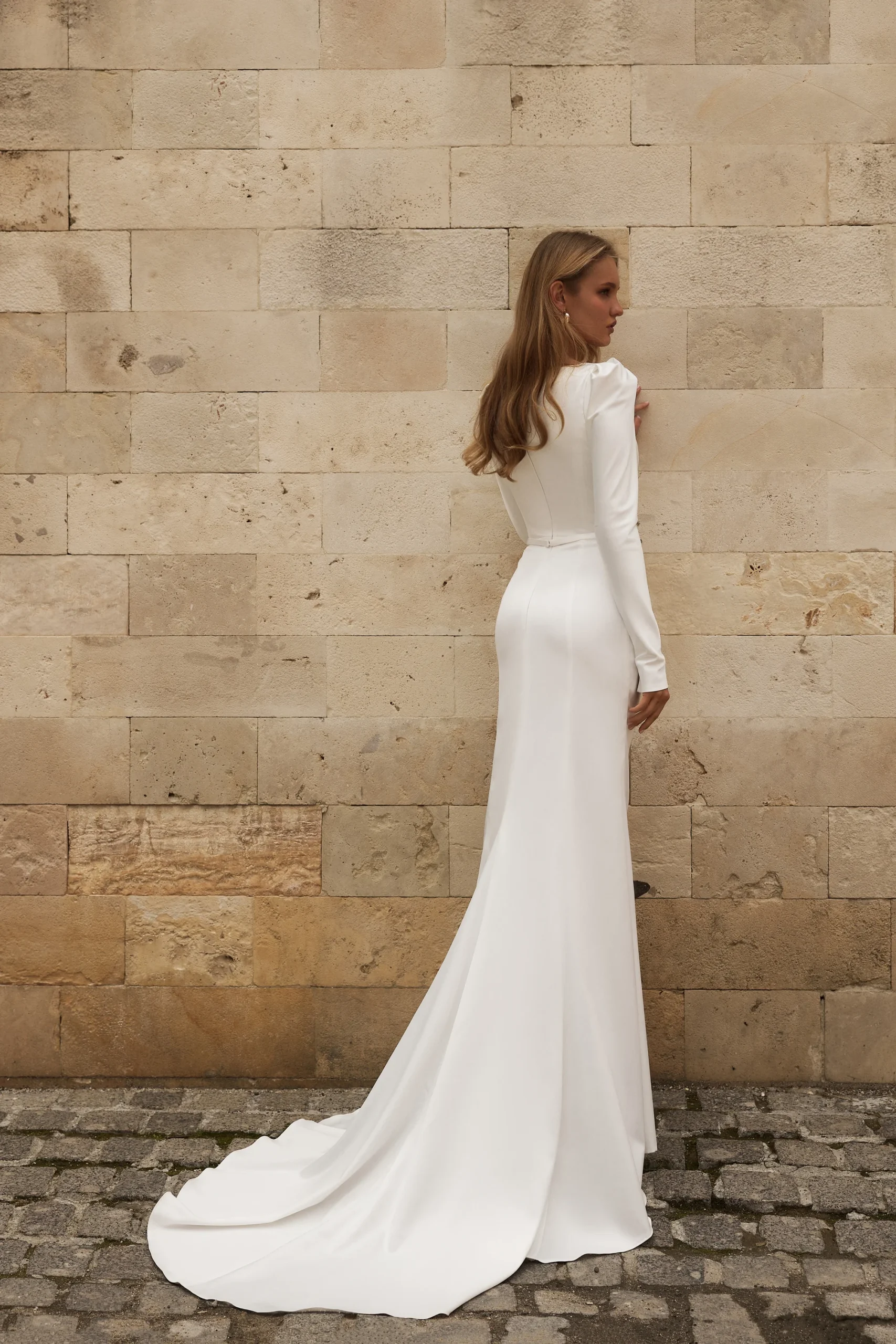 Сониа СолейЭлегантное свадебное платье прямого силуэта из гладкого атласа с изящным разрезом на юбке и длинными рукавами. Лаконичный крой подчёркивает утончённость образа, создавая гармонию строгости и изысканной женственности.